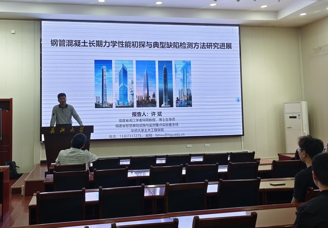 在就业宣讲大厅开展关于“钢管混凝土长期力学性能初探与典型缺陷检测方法研究进展”讲座,此次讲座邀请到福建省闽江学者特聘教授、福建省智慧基础设施与监测重点实验室主任、华侨大学土木工程学院的许斌教授,土木工程系教师及全体研究生到场聆听学习。