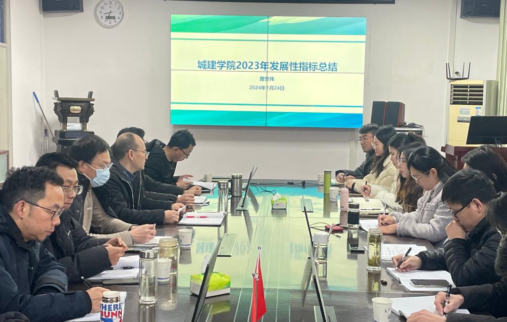 的发展性指标数据。学工办主任魏民生、城乡规划系丰燕、建筑学系徐齐帆、给排水科学与工程系吴小刚、土木工程系李振依次结合本部门发展性指标的完成情况做总结汇报,并重点指出存在的问题,同时明确了2024年的工作目标。