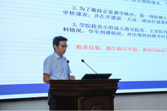 黄向阳副院长围绕近期教学工作,指出本学期要重点推进一流学科建设、加强学生尤其是大一新生专业认知教育,不断引导学生提高创业创新精神,增强实践能力,同时进一步推动与省内外高校的科研教育合作。黄院长还强调全体教职工要不断加强师德师风学习,做一名合格的大学教师。