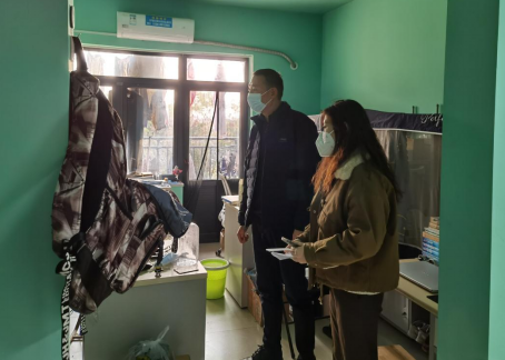 在南苑22栋B区学生寝室,彭飞、曾磊、叶长才、肖桃李等院领导详细询问同学们的学习情况;细心叮嘱同学们天气寒冷,注意及时增减衣物,预防感冒;要注意寝室用电安全,避免发生用电起火等情况;要做好室内消杀工作,定期通风,注意卫生;离校途中做好个人防护,注意出行安全。