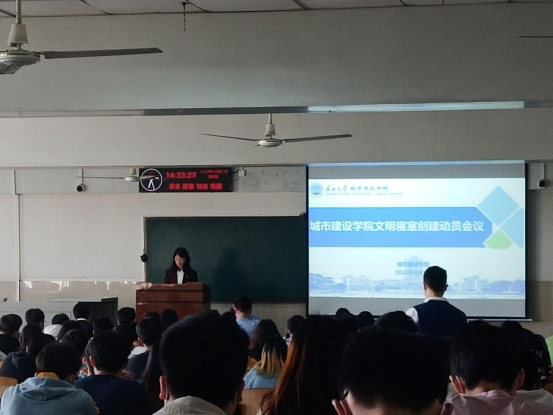 于4月7日下午2点半在东校区12教202教室召开文明寝室创建动员会议,院党委副书记周俊、全体辅导员,党员代表、寝室长代表、院团委学生会成员、院学生楼栋管理委员会成员,会议由学院17级辅导员胡冰恒主持。