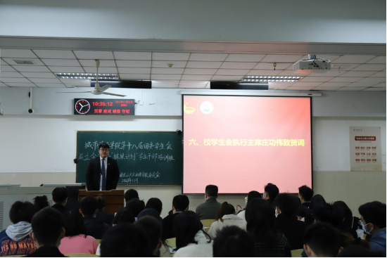 在新一届成员学习科创部的牟睿聪和院团委组织部的张俊伟发言后,校学生会执行主席庄功伟上台代表校学生会对城建学院第十八届团委学生会的成立表示祝贺,并表示今后将继续促进校院两级学生会工作联动,共同促进。