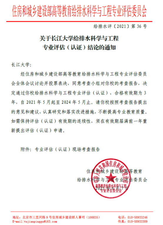 给排水科学与工程专业评估(认证)的通知》(给排水评〔2021〕第36号),我院给排水科学与工程专业通过了此次评估,有效期自2021年5月至2024年5月,为今年全校专业评估(认证)工作赢得了开门红。