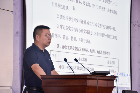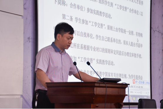 副院长曾磊具体部署了2019年学院工学交替的实习工作。他指出,“我们有重点的联系了近30家合作单位,包括央企、国企、事业单位、优秀民企,提供了近500个实习岗位,相信一定能给同学们带来真实有效的实习实践体验,使我们将来的就业更有针对性和方向性”。