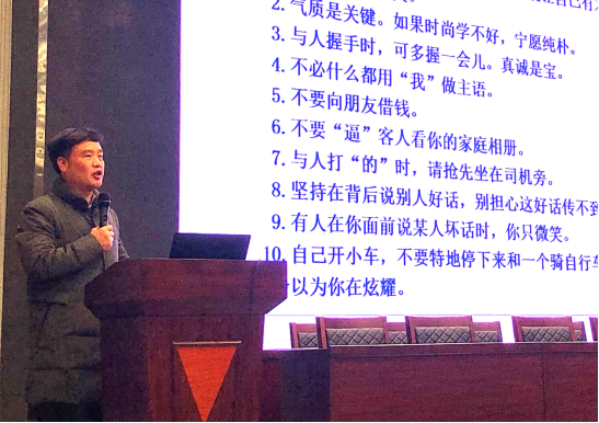 在知识方面,他指出,知识是人们在实践中获得的认识和经验,同学们既要有知识也要有文化。他建议同学们要找到最适合自己的学习方式同时要抓住课上有限的时间来高效的学习,在课后要学会整合知识点、多做练习来加深记忆。他强调,同学们重视自身德智体美劳全面发展,提升自己的综合素质。在常识方面,他说:“常识就是普遍知识。”紧接着,周俊对社交礼仪常识中的做人的原则进行了重点强调,他认为多观察、多思考、多交流是掌握常识的最好途径。在见识方面,他讲到:“见识就是要开阔自己的眼界,增长自己的知识面。” 他希望同学们能够多读一些经典的书籍、多参加一些有意义的活动以及多关注一些社会上的要闻以此来增长见识。