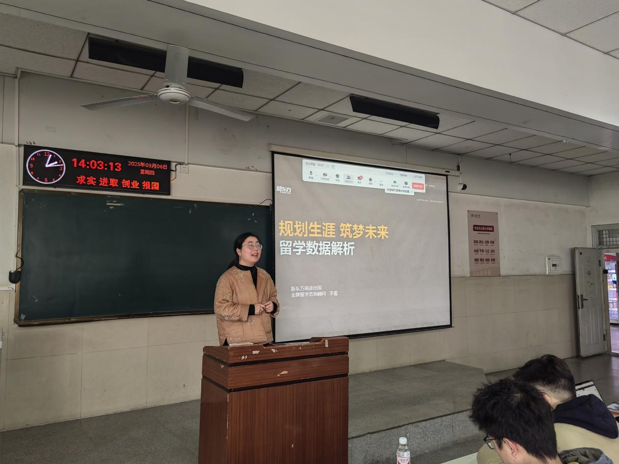 讲座伊始,新东方留学规划导师李盈结合土木工程专业的特点,系统地解析了海外高校研究生申请流程、材料准备及院校选择策略。她以英美澳加等留学国家为例,详细对比了不同高校的专业优势、申请门槛和奖学金政策,并建议同学们要“立足自身兴趣,锚定职业目标,分阶段提升学术背景与综合能力”。针对不同年级的学生,李盈分别给出了具体的建议:对于低年级学生,她强调要重视语言考试和科研实践;对于高年级学生,要把握时间规划与文书撰写的关键节点。