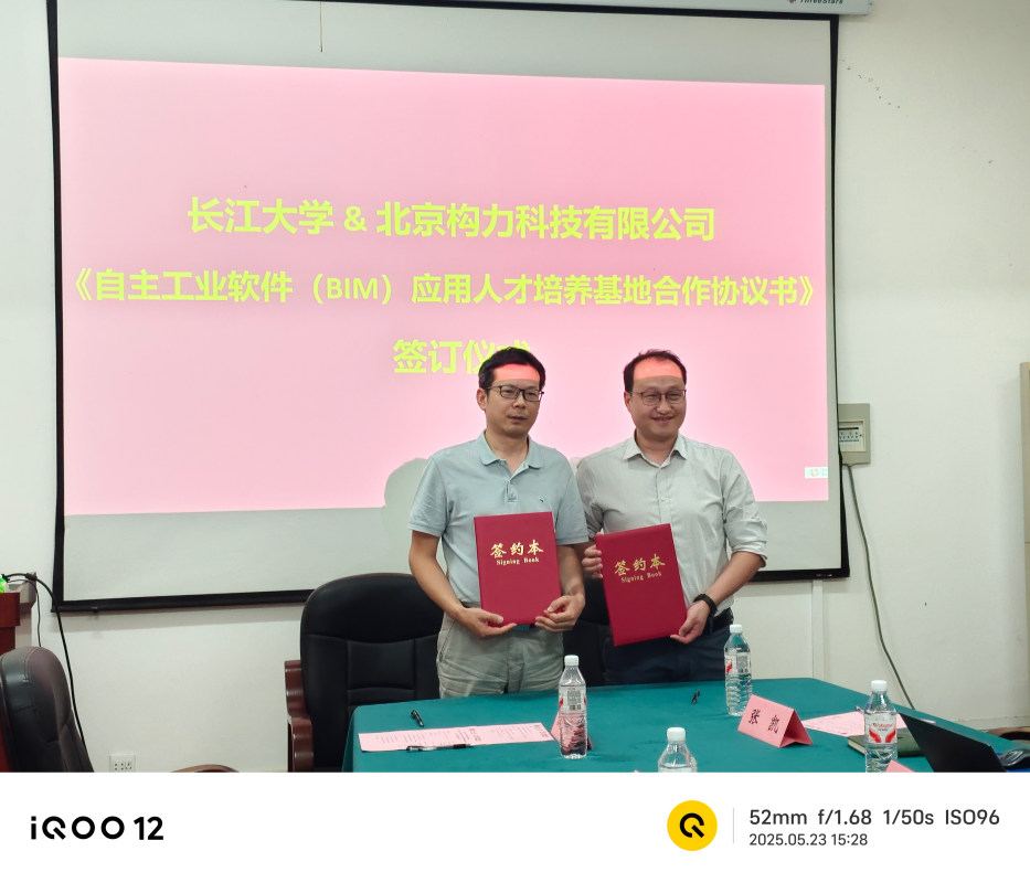 在智能建造、信息化建设、自主工业软件(BIM)应用人才培养、学生就业等方面工作。楚仲国总经理介绍构力科技并说明本次合作意图,表达了构力科技对高校的支持和校企合作前景。随后黄向阳与楚仲国分别代表校企双方进行了基地签约和揭牌仪式。