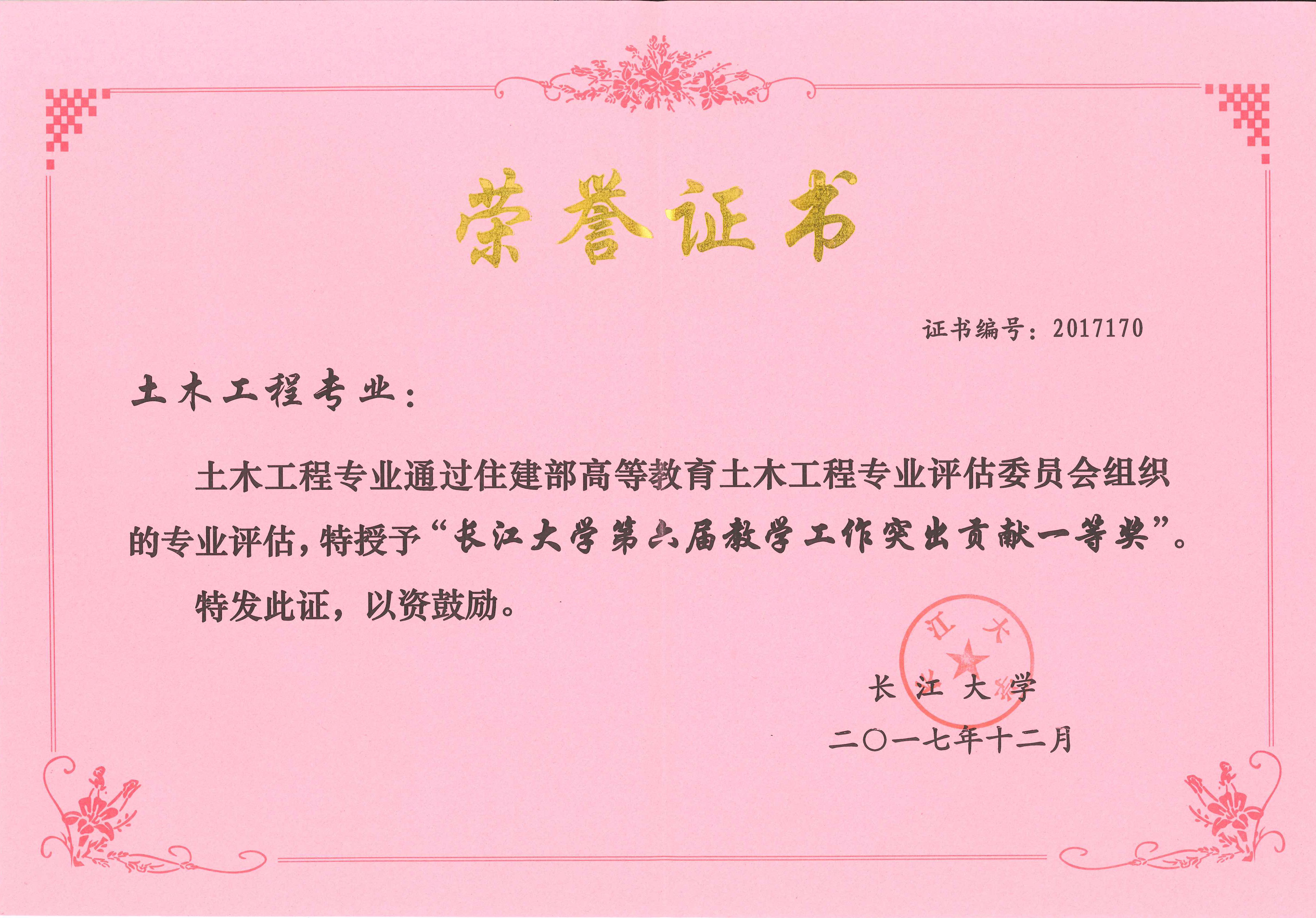 土木工程专业获得校第六届教学工作突出贡献一等奖