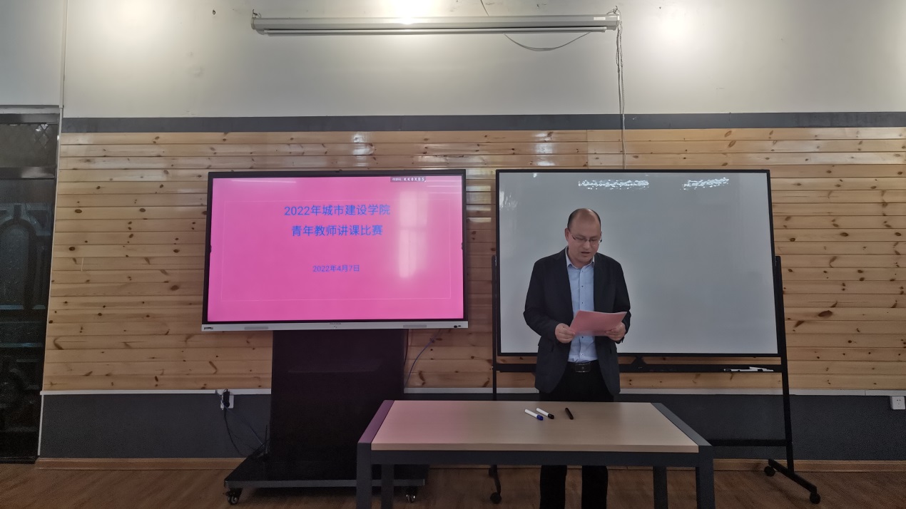 青年教师讲课比赛决赛于东校区二教展厅举行。校教务处副处长郑健,学院党委书记孙涛,学院教学副院长肖桃李,教学创新大赛省赛、国赛获得者,湖北省“青年教学能手”张静、省级精品课程公开课负责人、国务院政府特殊津贴获得者程庆华,土木工程专业创始人、学院发展奠基人马成松教授以及城建学院教师参加此次会议。