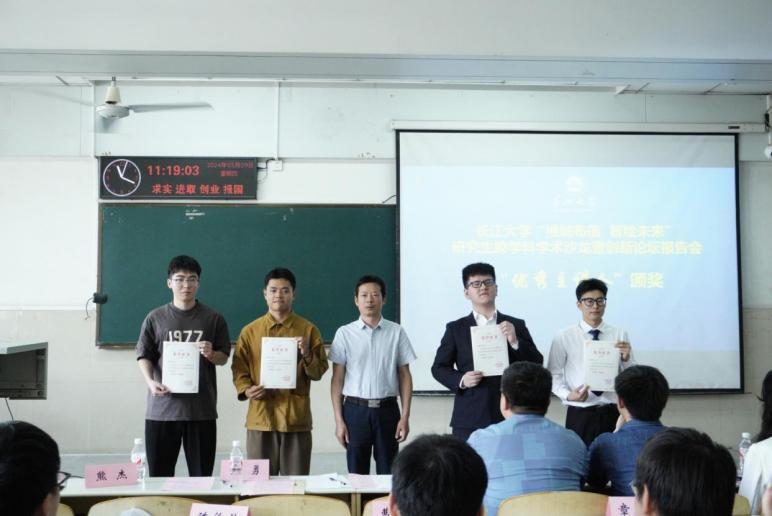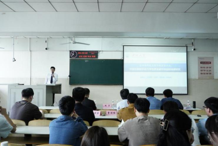 随后,城建学院章德超、马乾坤,电信学院陈俊荣、曹熠程四位同学分别就《共面双裂隙砂岩力学性质及破坏特征的规律研究》;《井下动液面深度测量方法与仪器研究》;《掺加不同辅助胶凝材料橡胶混凝土高温后性能及超声评估研究》和学科竞赛相关经验依次做出分享。