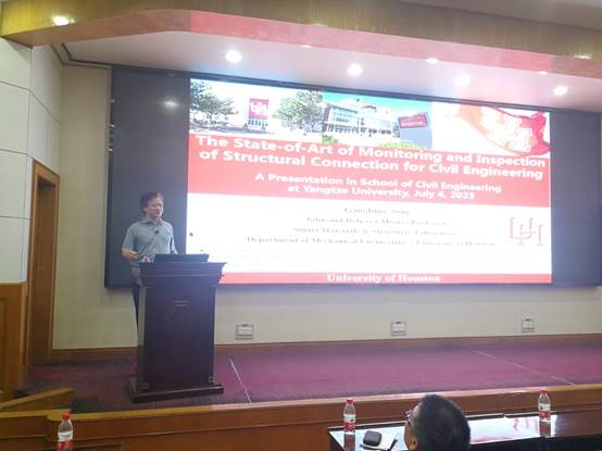 在11教学术报告厅举行了“长大20年”学术论坛暨长江城建讲坛(2023年第七讲)的学术讲座。美国休斯顿大学智能材料和结构实验室创始人、实验室主任、美国休斯顿大学宋钢兵教授做客讲坛,并为学院师生作了题为“The State-of-the Art in Monitoring and Inspection of Structural Connection for Civil Engineering”的学术讲座,学院大约120位教师和研究生参加了此次活动。