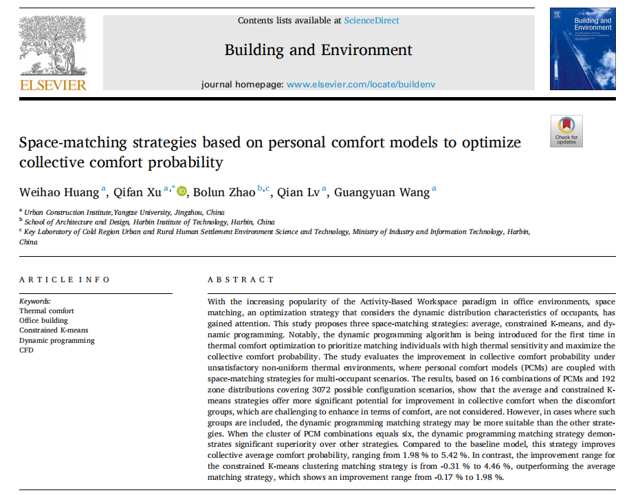 通讯员 杨洁晶近日,我院城市建设学院硕士生黄炜皓作为第一作者,在中科院工程技术大类一区Top期刊Building and Environment 5IF=7.2发表题为Space-matching strategies based on personal comfort models to optimize collective comfort probability”的研究论文,首次提出动态规划算法在建筑热舒适优化中的应用,为多人员办公环境下的集体舒适度提升提供了创新解决方案。