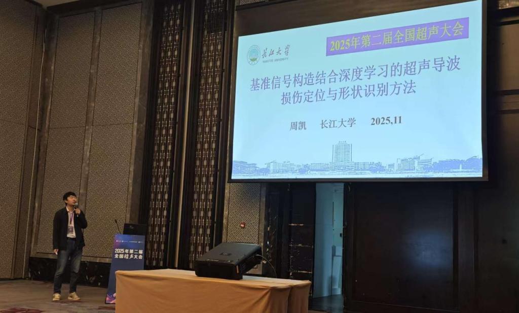 周凯副教授作题为“基准信号构造结合深度学习的超声导波损伤定位与形状识别方法”的学术报告,并作为主持人之一在超声导波与健康监测专题、检测超声专题主持了部分报告。该报告阐述了结构损伤检测的重要意义、超声导波检测技术的研究现状以及其在超声导波损伤定位与形状识别方面的研究成果。这一方法克服了超声导波检测技术中信号特征提取和损伤形状识别困难的问题,为结构损伤检测带来了创新的解决方案,报告内容得到与会学者的充分肯定。
