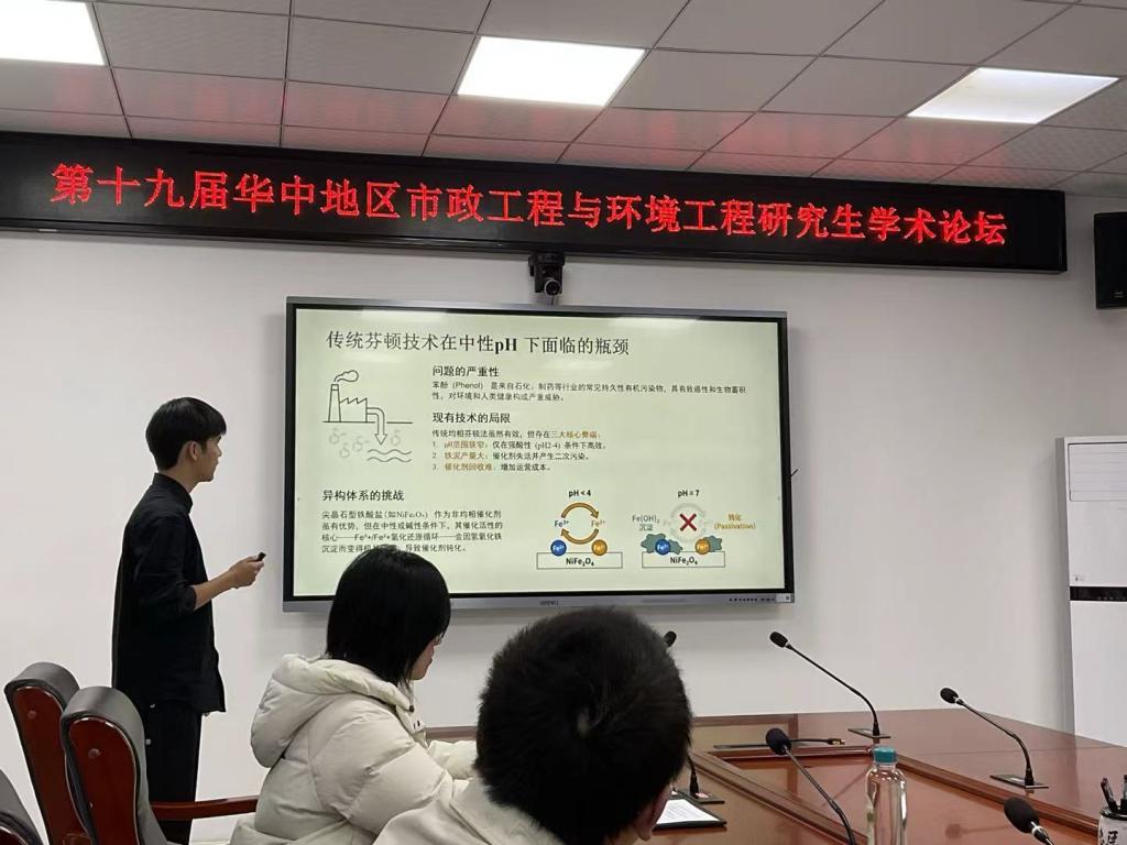 2024级研究生詹哲圆作题为“羟胺增强的NiFe₂O₄/过氧化氢类芬顿体系在中性pH下高效降解苯酚:Fe³⁺/Fe²⁺和Ni³⁺/Ni²⁺循环的双重促进”的分享汇报,阐释羟胺对金属价态循环与降解性能的促进机制,为类芬顿技术在中性条件下的应用拓展提供新思路。