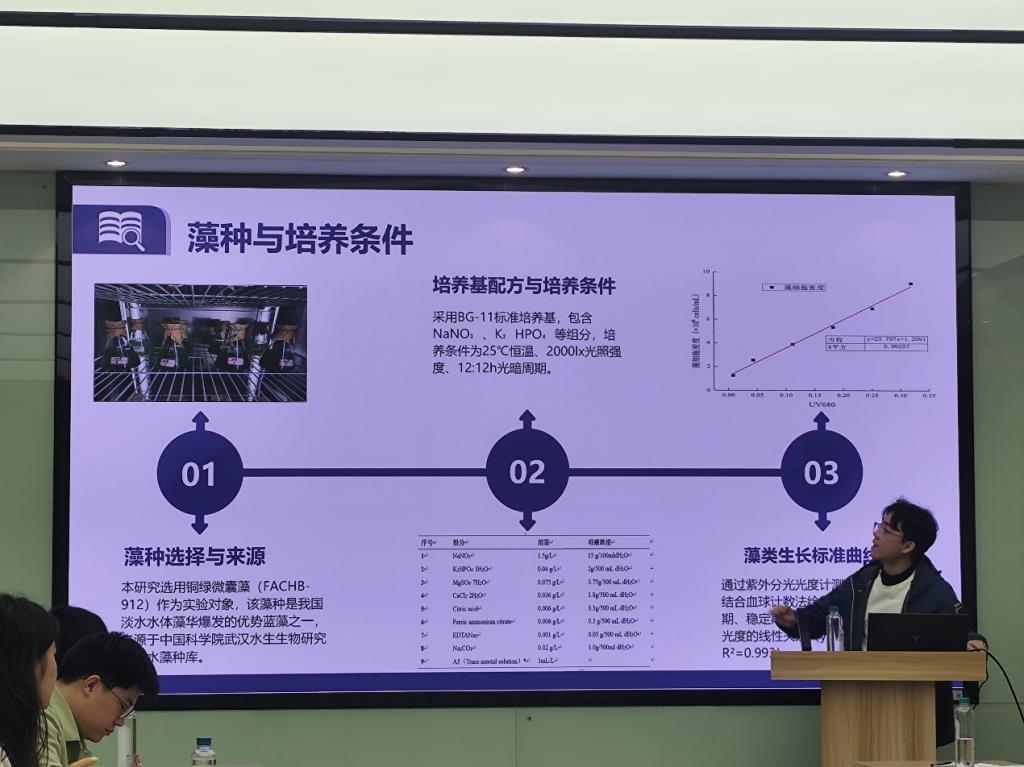 2023级研究生张凯作题为“氯/二氧化氯消毒下铜绿微囊藻源消毒副产物生成动力学”的学术汇报,系统探讨藻类污染水源在氯及二氧化氯消毒条件下消毒副产物生成的动力学特征与影响因素,为消毒过程风险控制提供参考。