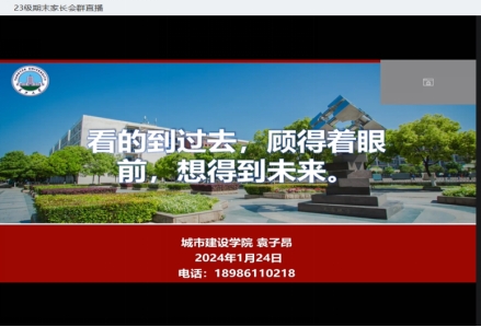 (通讯员 勾彤) 为进一步加强家校沟通,提高家校育人合力。1月24日晚,城建学院召开2023级线上期末家长会,院党委副书记周洁如、党建秘书胡冰恒、2023级全体学生及家长参加本次会议,会议由2023级辅导员袁子昂主持。
