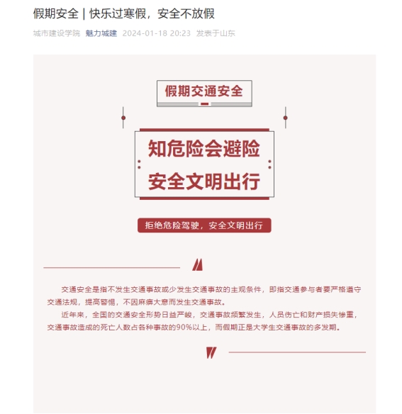 通过学院微信公众号、年级群等线上平台,编辑发布一系列温馨提示,提醒广大学生遵守交通安全规则,文明出行,共同维护良好的校园交通秩序。加强交通安全教育覆盖面同时,通过学院—班级—宿舍长三级联动、师生一对一联系等方式,做好目前在校学生晚点名工作,及时了解已离校学生安全到家情况。