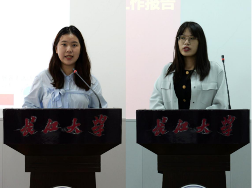 第十九届院学生会主席团成员叶文慧、院研学会主席团成员柯婷依次上台作工作报告。她们分别从组织概况、组织建设、学生服务、工作成绩三个方面展开介绍。工作汇报结束后,大家一致举手表决通过。