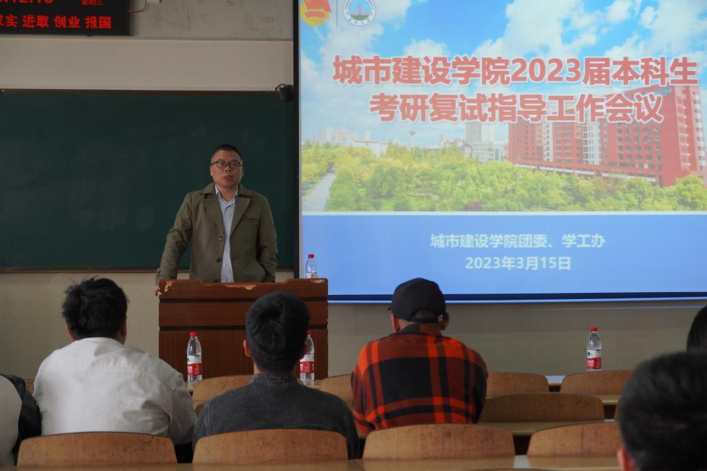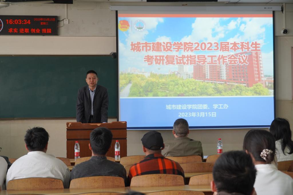 于12教202召开2023届考研备考及复试指导会议,通过讲座与交流会的形式,现场指导并解答考研学子关于考研后调剂与复试等方面的问题。城建学院副院长张继承、院党委副书记秦良斌、就业专干胡冰恒出席本次会议,本次会议由团委副书记何儒权主持。