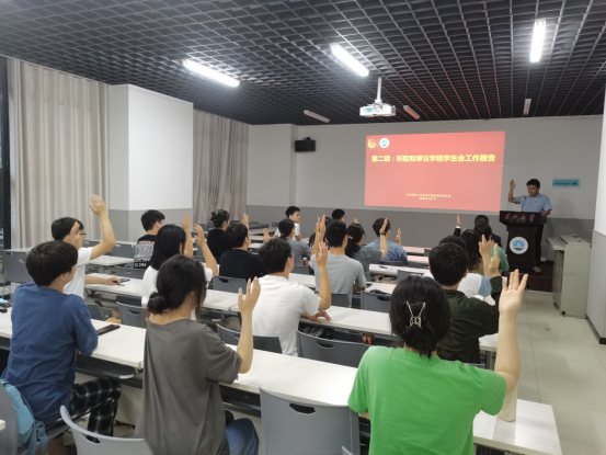 会议伊始,在何儒权老师的带领下,全体学生代表起立,奏唱国歌。随后,由学生会主席余江生、研究生学生会团委副书记杨民分别汇报本学年学生会、研究生会的工作报告。他们分别从组织建设、学风建设、思想建设、学生服务四个方面介绍了学生工作情况。工作汇报结束后,大家一致举手表决通过。