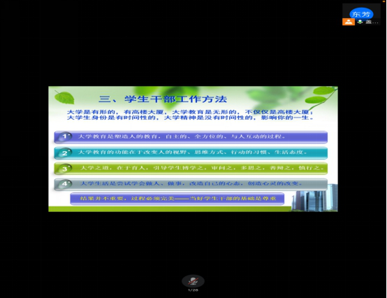 此后,电子信息工程学院康玮老师通过腾讯会议的方式为同学们讲解班团一体化建设理论与实践。康老师主要为大家介绍了班团一体化的基本概念,强调了班团一体化的重要性,展示了班级和团支部建设运行中的主要现状和问题,明确了新形势下的班团一体建设的实施途径。同时,康老师提出了班团关系的新界定,班团目标的一体化设计,班团运行的一体化推进,班团干部的一体化设置和班团管理的一体化统筹。康老师的讲解为51成人网