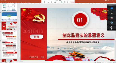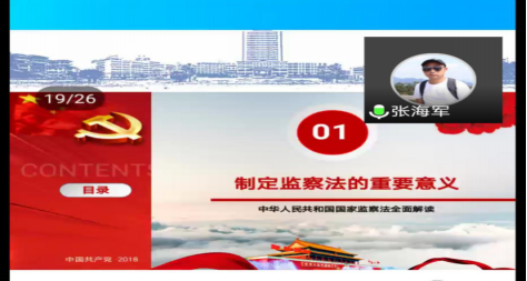 各班团支部将“学习监察法,争做廉洁人”作为6月主题班团会主要内容之一,通过腾讯会议和QQ群等线上方式,组织同学们一起观看学习《学习监察法,争做廉洁人》专家视频讲座(微团课)、《2018 版中华人民共和国监察法学习解读》PPT 资料、监察法知识在线学习(线上课堂),同时,各班还积极号召同学们通过长大长青公众号进行《中华人民共和国监察法》知识测试。