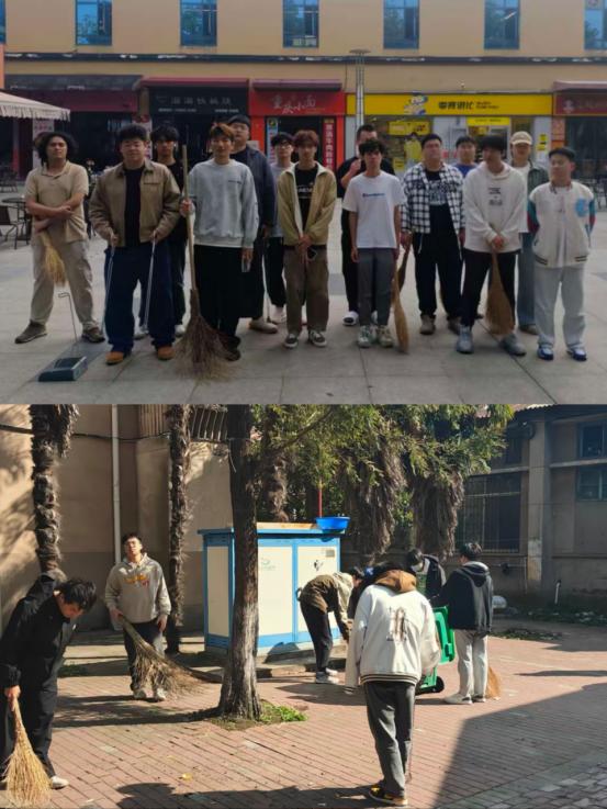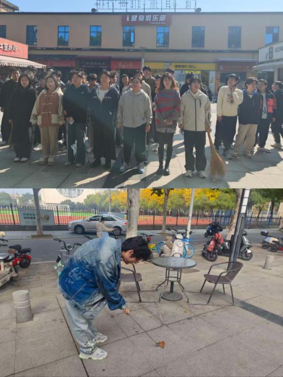 组织近120名学生在东校区万品汇广场开展劳动清扫活动,以实际行动美化校园环境。