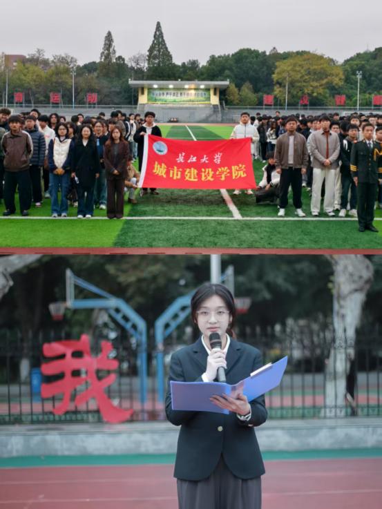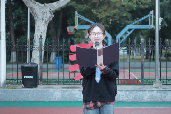 升旗仪式后,学生代表土木中外合作12202班于敏芮以《以青春之我,赴时代之约》为题发表演讲。她结合自身乡村支教经历与学科竞赛的经历,倡议同学们立足专业领域,将个人理想融入时代发展,以扎实的专业知识和不懈奋斗回应时代的召唤,在服务社会中充实青春之我。